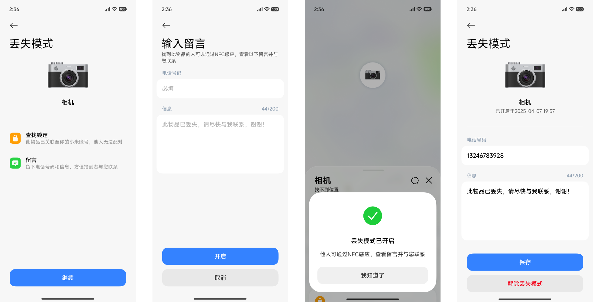- 当物品确认丢失时,可以开启“丢失模式”锁定此Xiaomi Tag防止他人配对使用,并留下自己的联系方式。他人捡到时,可将手机背面触碰NFC区域,感知通信后点击顶部弹窗,跳转至网页查看留言并与您联系。