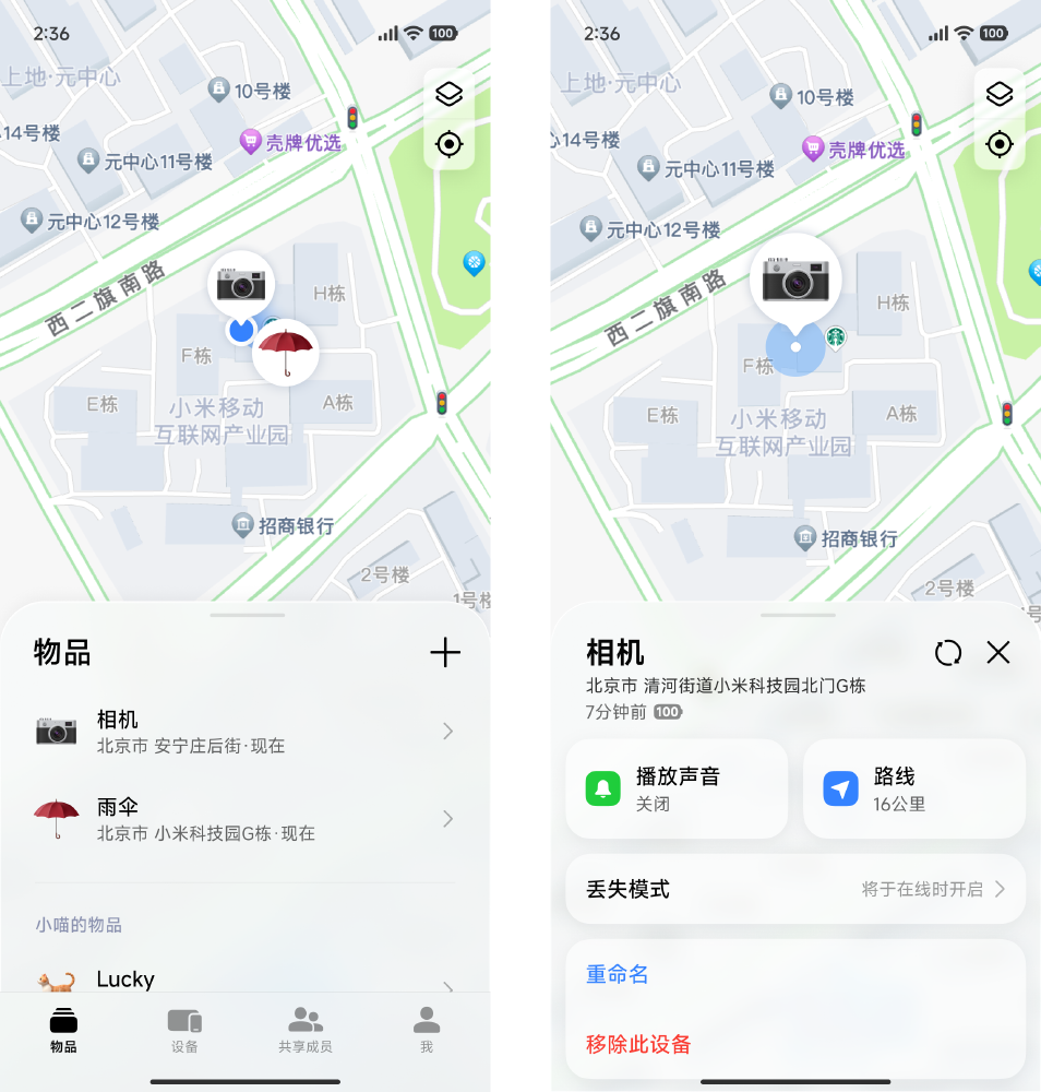 - 打开“查找设备”App,点击物品,即可在地图上看到Xiaomi Tag位置。要查看离线位置,请确保已开启本机 无网络定位 功能通过设备安全认证。