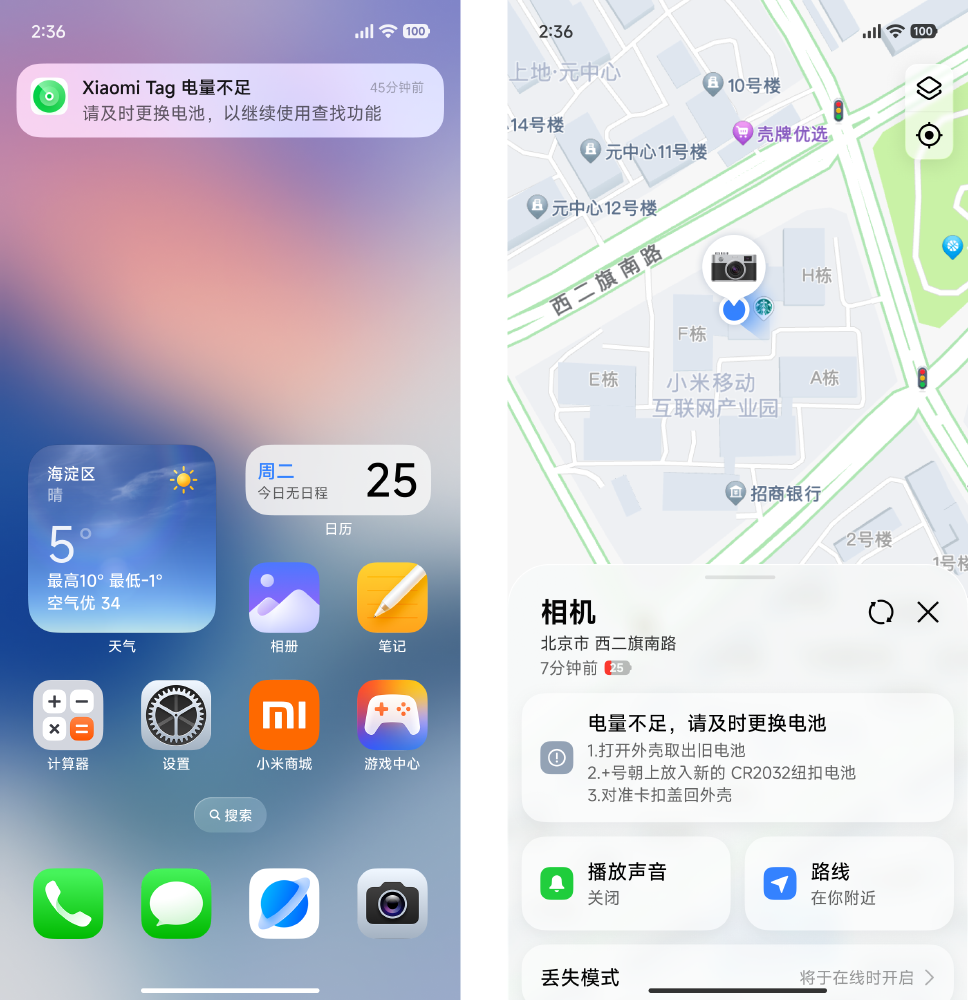 当您的Xiaomi Tag电量低于25%时,将会触发低电量提醒,建议您尽快更换电池,防止电量耗尽后,无法定位到物品。